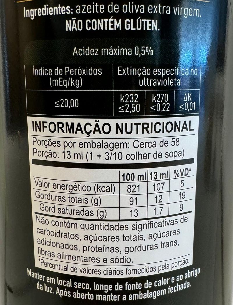 Ingredientes: Azeite de Oliva Extra Virgem